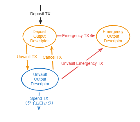 オレンジのトランザクション(矢印)はステークホルダーのマルチシグによって送金可能なもの、ブルーのトランザクションはマネージャーのマルチシグ+タイムロック+ステークホルダーの設定した条件を検証するサーバーの署名によって送金可能なものです。Unvault TXはSpend TXを配信したい場面がくるまでオフチェーンで保管されます。