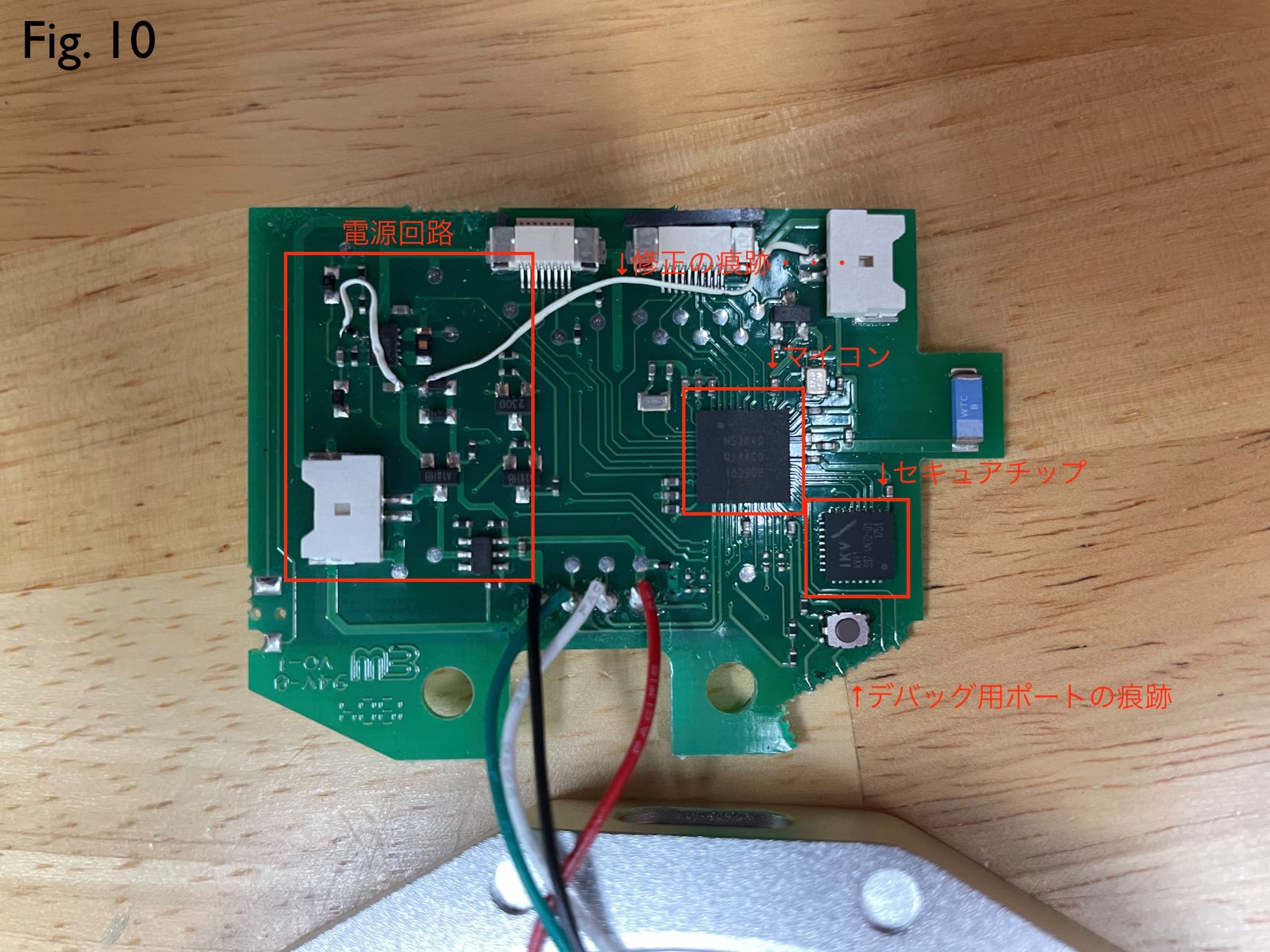 Fig. 10 メイン基板です。USBコネクタ用の基板とは4本の線で接続されています。引っ張ったら取れてしまいそうです・・・。上部に白い線が2本見えますが,これは明らかに設計ミスがあったため,製造後に手作業で修正しているものです。電子回路基板は作るために数万円程度の初期コストがかかりますので,開発中にはそれほど気軽に変更して作り直しはしません。そこで,手作業で修正することがあり,このようなことはよくしますが,大量生産品では手間がかかることや信頼性の面であまりおすすめできません。回路を細かく解析したわけではないので断言はできませんが,左の白い線は電源回路の修正,右の線は配線ミスの修正かなと推測しています。また基板の右下の斜めになっているところにデバッグ用ポートの痕跡があります。基板製造時にはこの斜めになっているところにも基板の続きがあり,デバッグ用の端子がついていて,そこから初期ファームウェアを書き込むのですが,書き込み終わったらキットカットみたいに割って取り外してしまいます。普通はさらにマイコン側でもデバッグポートを無効にする処理をするのですが,念の為,回路としても不正な書き込みをされにくいように切り離されています。簡単にアクセスはできるので,あまり意味は無いですが・・・
