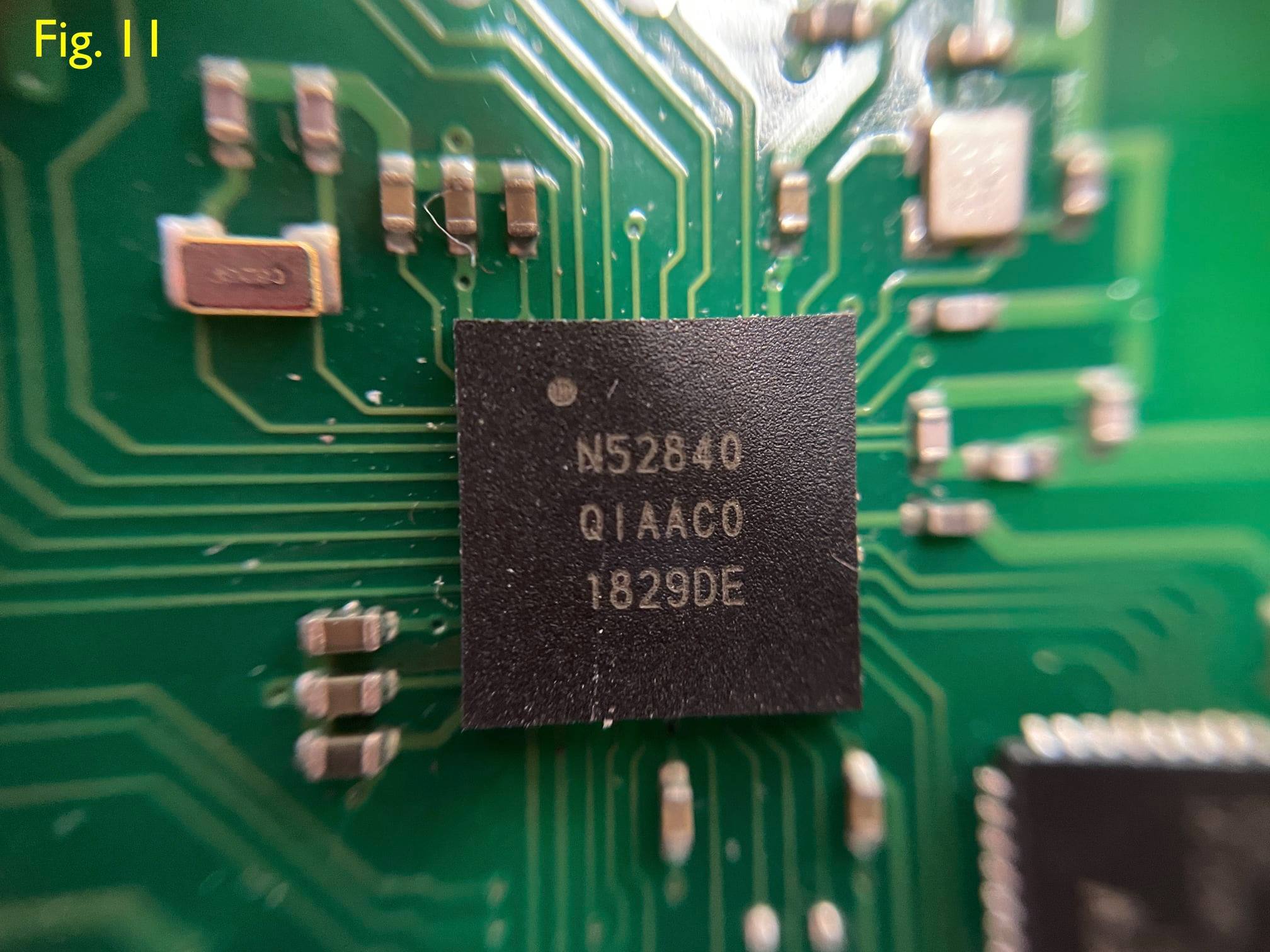 Fig. 11 つづいてマイコンをマクロレンズで撮影してみました。このマイコンはNordic semiconductorのnRF52840です(https://www.nordicsemi.com/Products/nRF52840)。このマイコンはArmのCortex-M4というシリーズのコアをつかっていることや,BLEを搭載しているので,IoT関係ではよく使われる割と有名所のものです。情報も多く開発しやすいのではないかと思います。