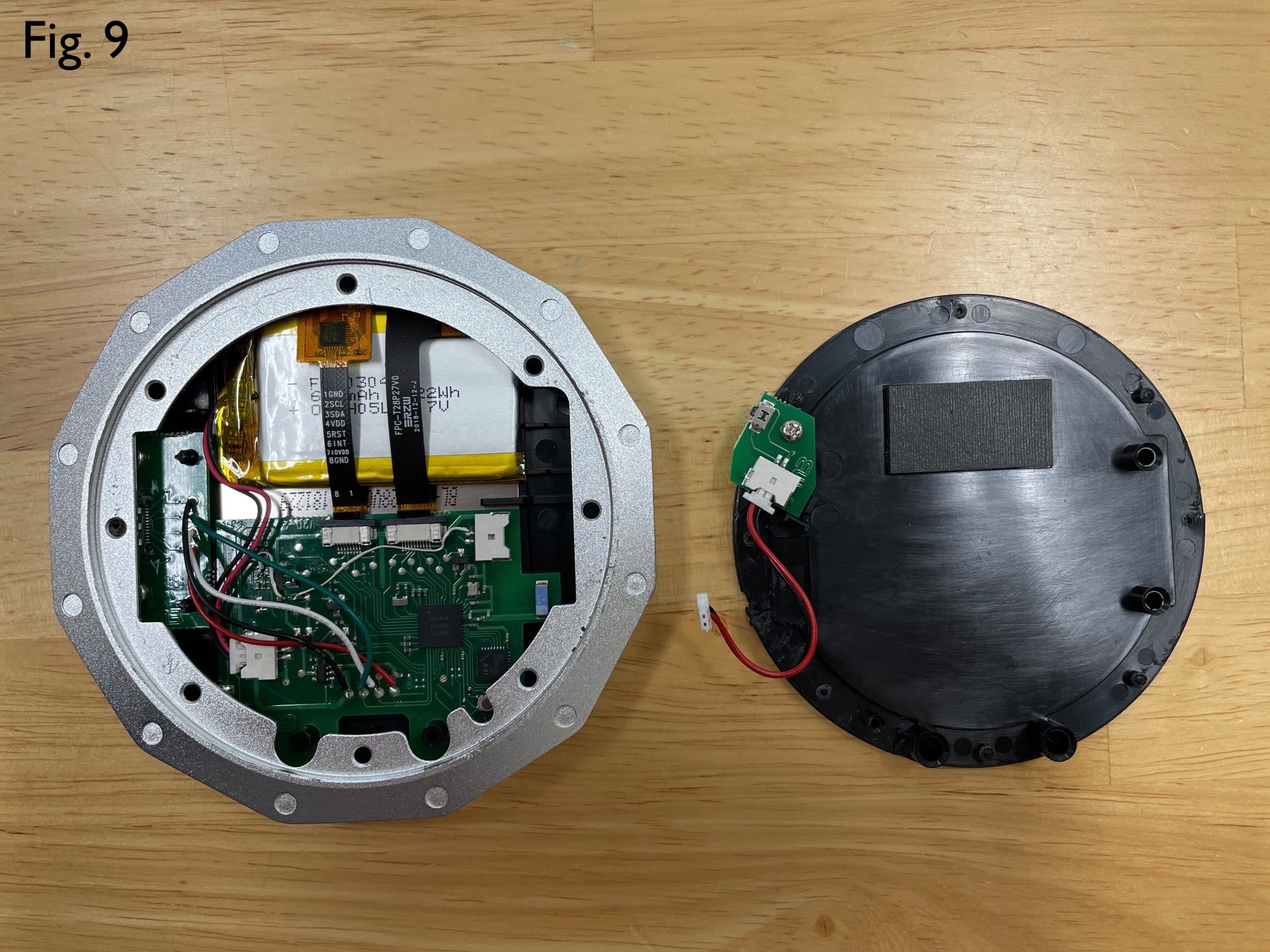 Fig. 9 さっそく裏蓋を開けてみます。中身はスカスカでほとんど周りの金属部の重さであったことが分かります。3枚の電子回路基板で構成されています。真ん中のものがメイン基板,右の小さな基板は電源スイッチ用,左にある半分隠れているものはUSBコネクタ用です。
