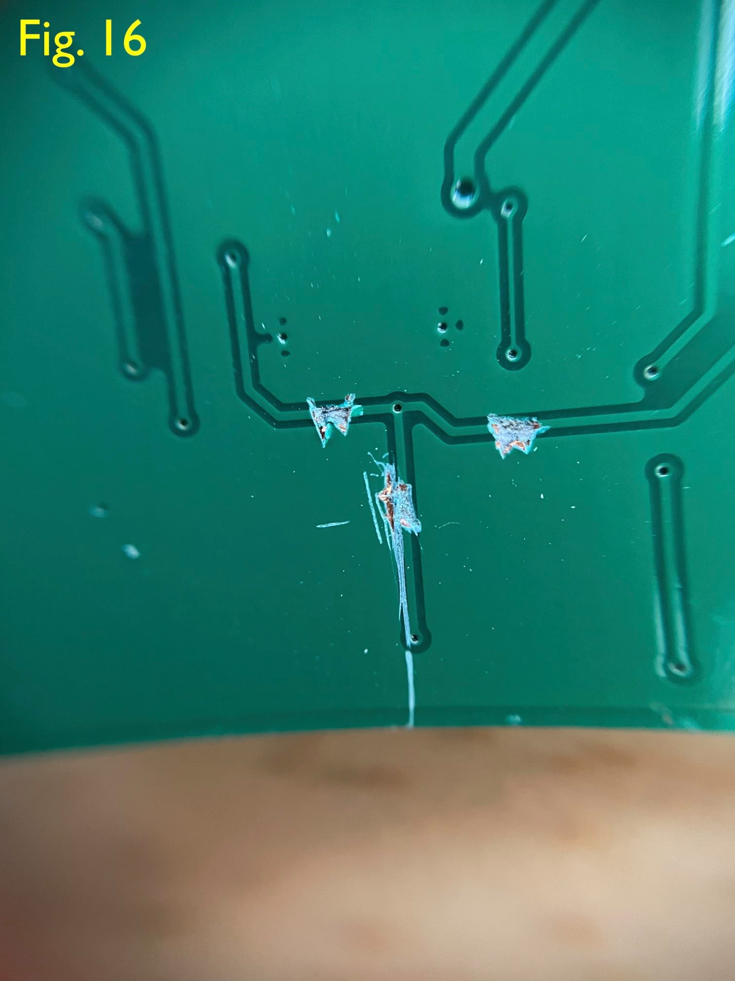 Fig. 16 おまけです。メイン基板の裏をみたら,配線のパターンが一部切断されている跡がありました。