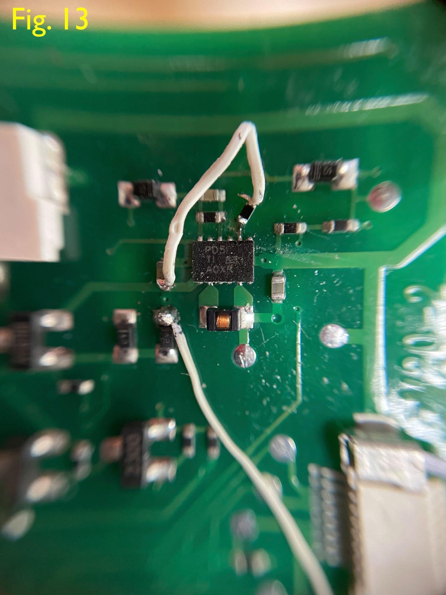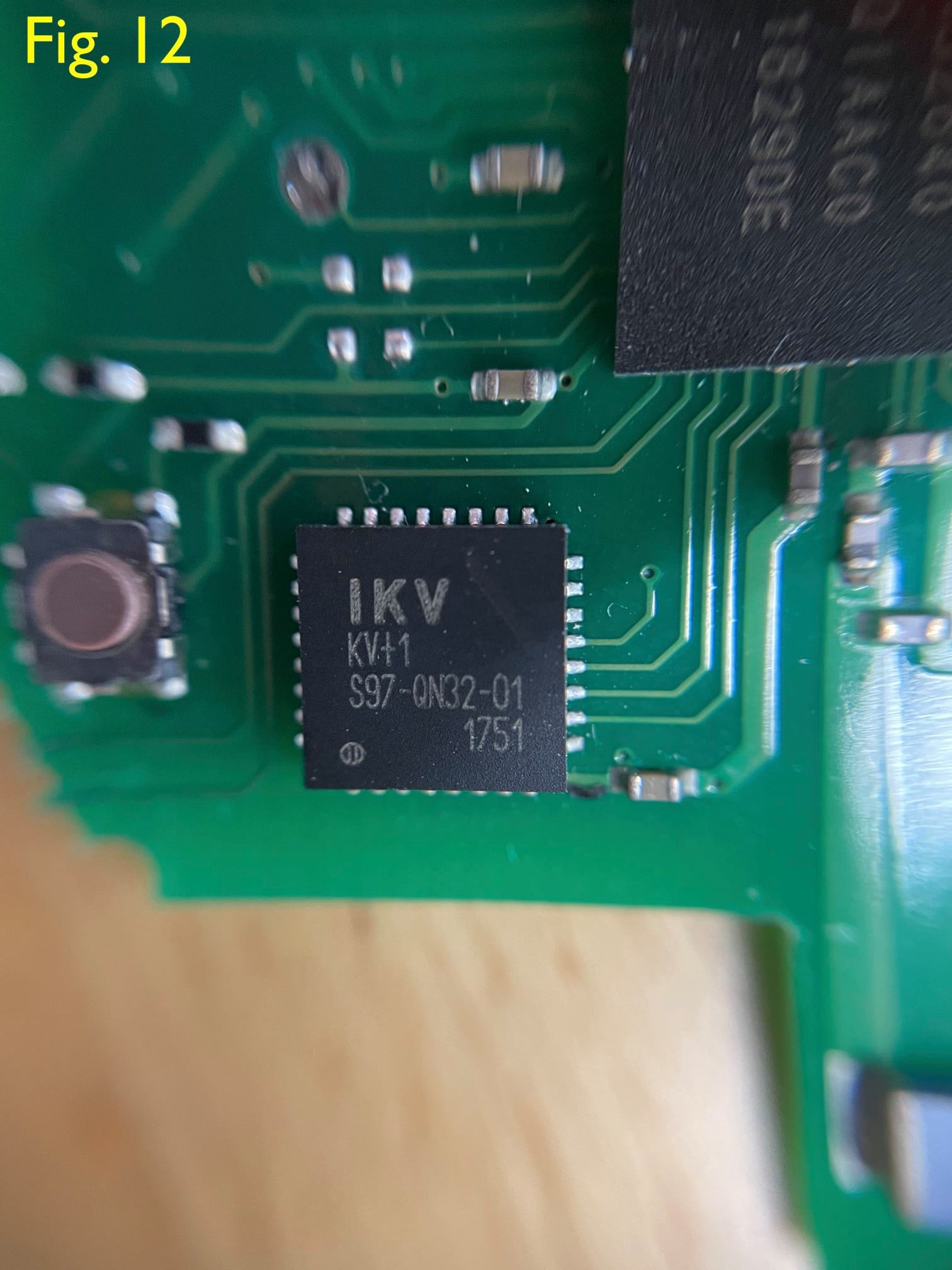Fig. 12 こちらはセキュアチップです。Infineon(インフィニオン)というドイツの企業が製造しているIKVというシリーズのセキュアチップです(https://www.infineon.com/.../Preferred-Security.../ikv/))。セキュアチップを使うことで,比較的安全に秘密鍵をチップ内に保存しておくことができます。右側に5本線が出ていますが,一番下はおそらく電源で,残り4本がマイコンとの通信用の線です。チップに関する詳細な情報は公開されていないのですが,本数からするとSPIという通信方式ですので,それらしき通信をしているかどうか解析できるかもしれませんので,いつかやってみようと思っています。