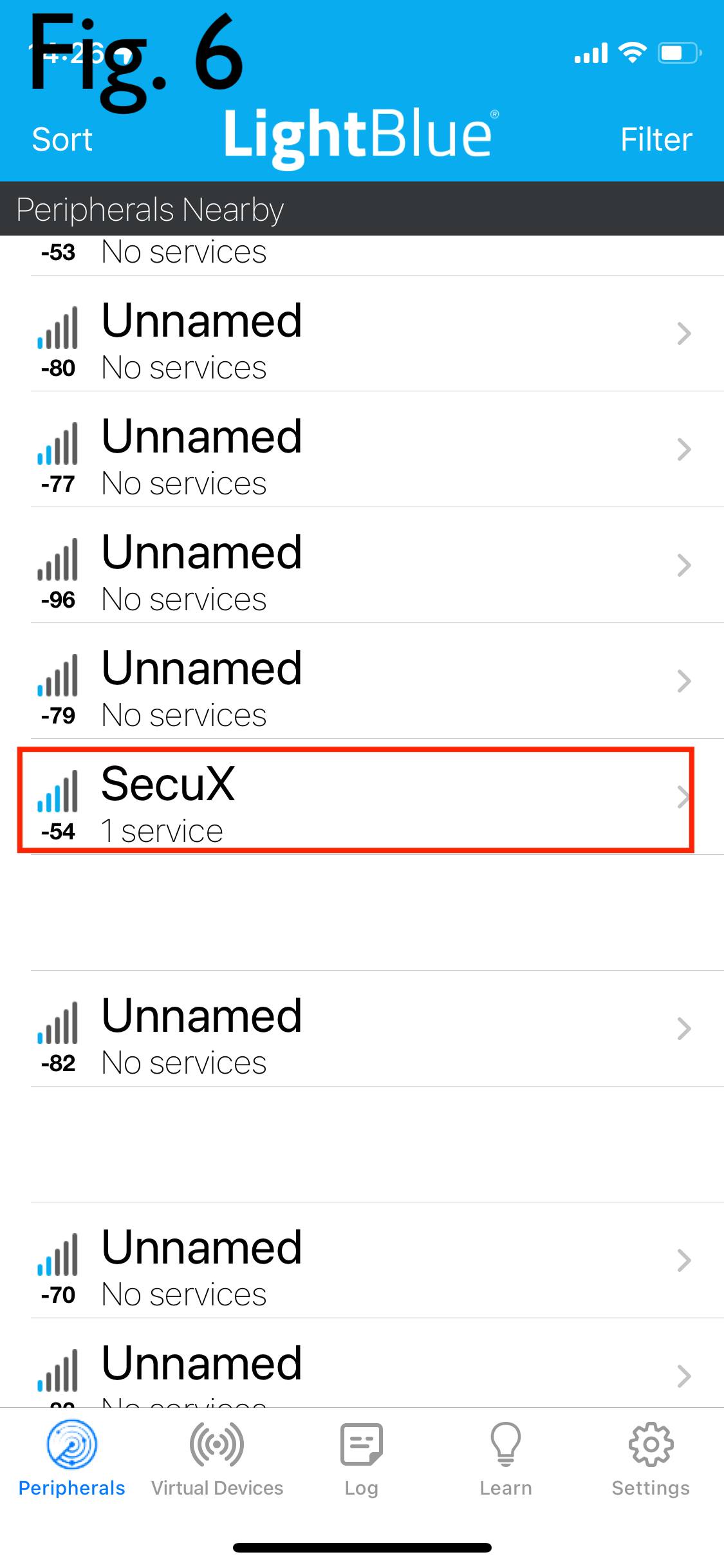 Fig. 6 BLEをモニタリングするアプリを使ってみるとSecuXという文字が見えます。ついでに,様々なBLE対応の機器が近くにあることも分かります。BLEはプロトコル上最大で400mまで通信距離を伸ばすことができるそうですが,設定によって通信距離を短くすることもできます。余談ですが,BLEの機能として大雑把な距離を測定することもでき,ビーコンや接触確認アプリなどに応用されています。