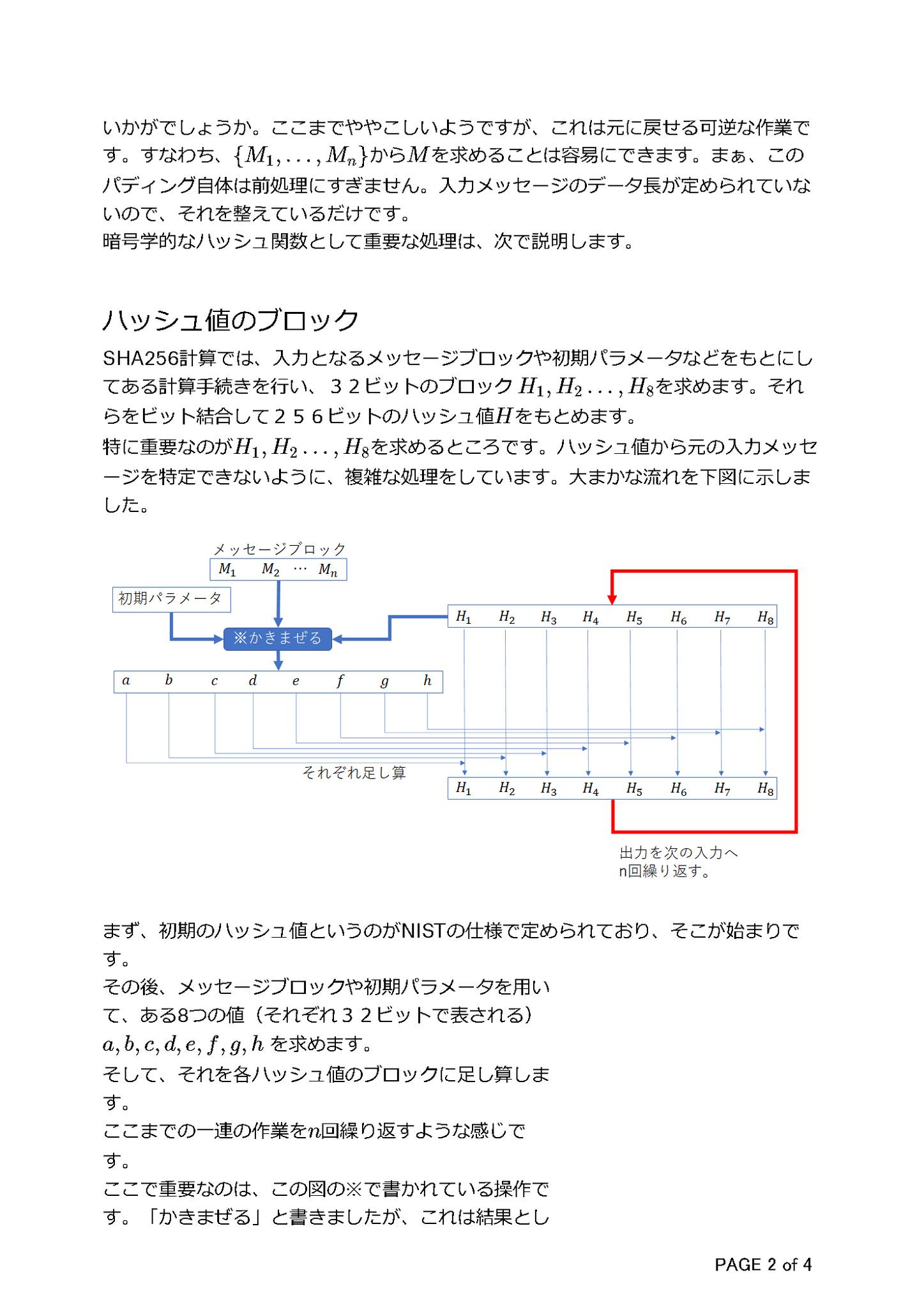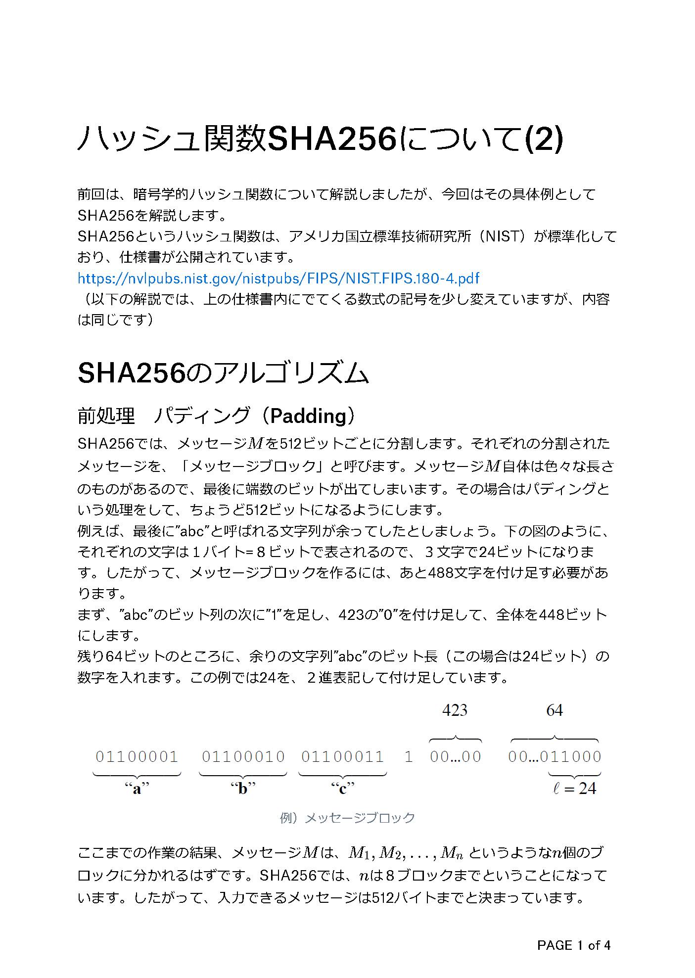 SHA256というハッシュ関数は、アメリカ国立標準技術研究所(NIST)が標準化しており、仕様書が公開されています。