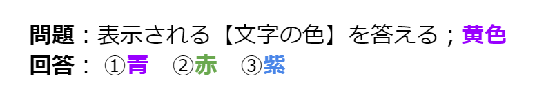 直感だけだと文字色と同じ①の青を選びそうになってしまいますが、正解は③の紫になります。論理性を問われるような問題になっているわけですね。