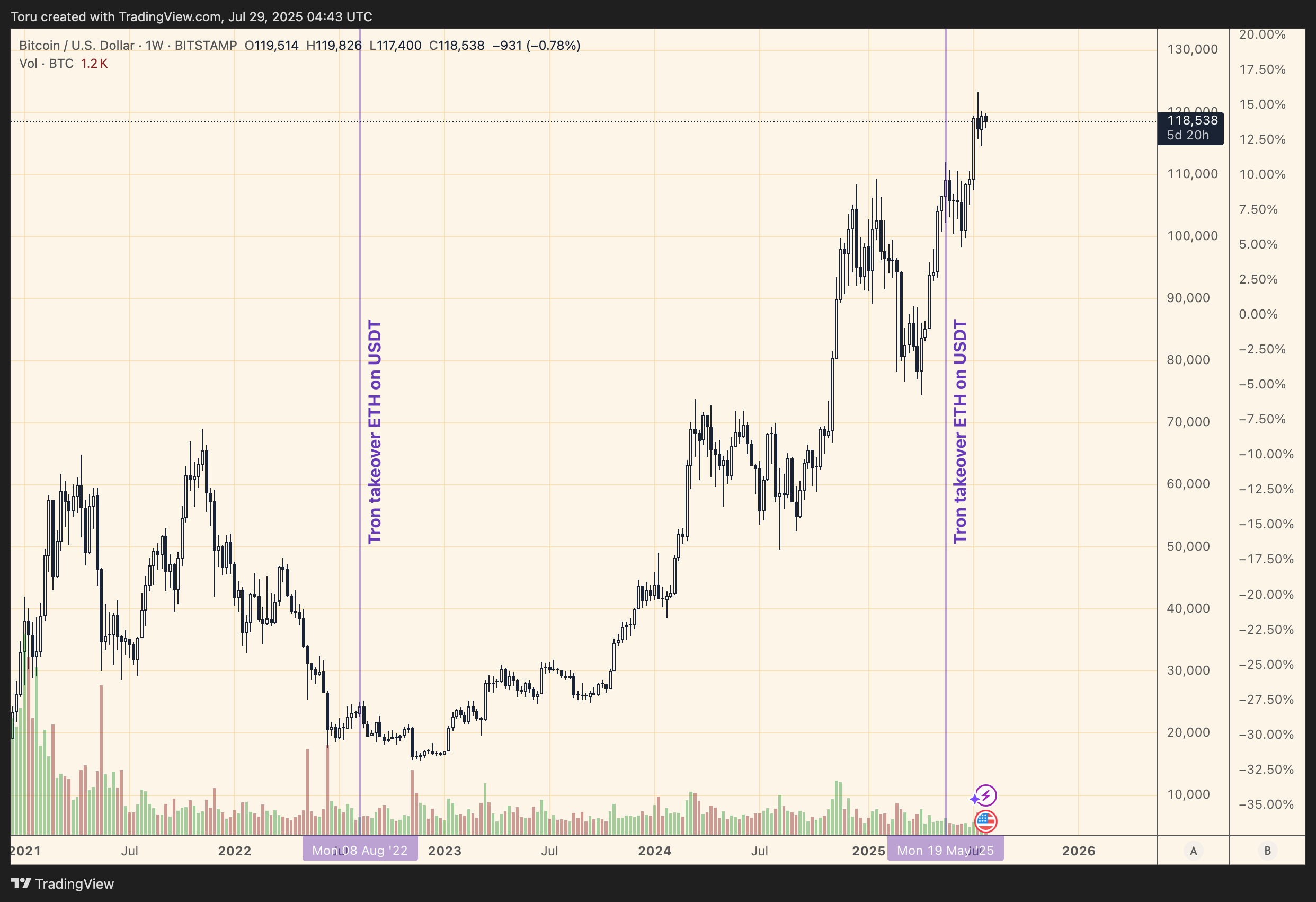 図3は、ビットコインの価格推移において、トロンがイーサリアムをUSDT上の発行残高で上回ったタイミングを描画したチャートです。