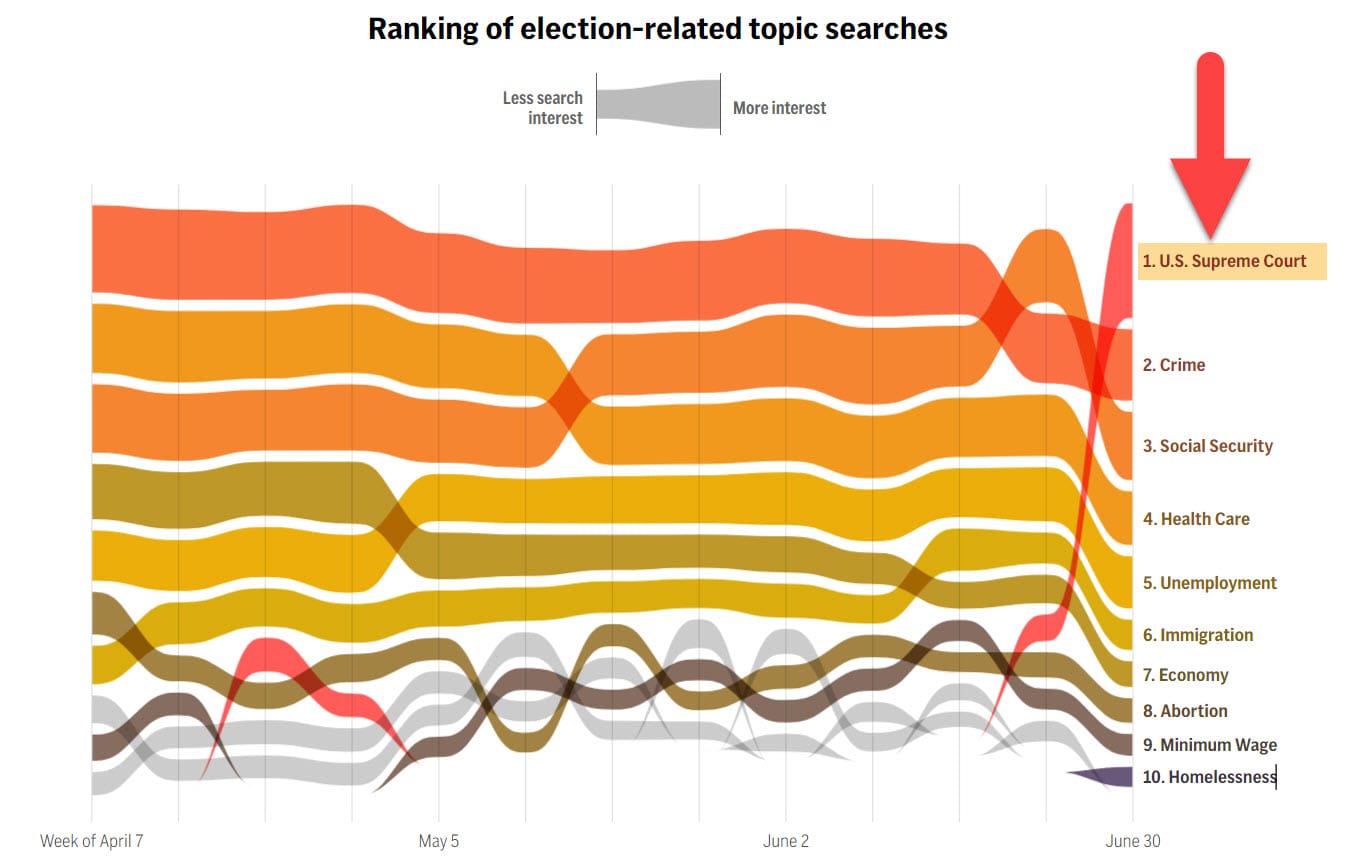 これまで、関心の上位は社会保障・犯罪対策・ヘルスケア・失業対策が常連でした。そこに突如、圏外からトップに躍り出てきたのが「アメリカ合衆国最高裁判所」です。