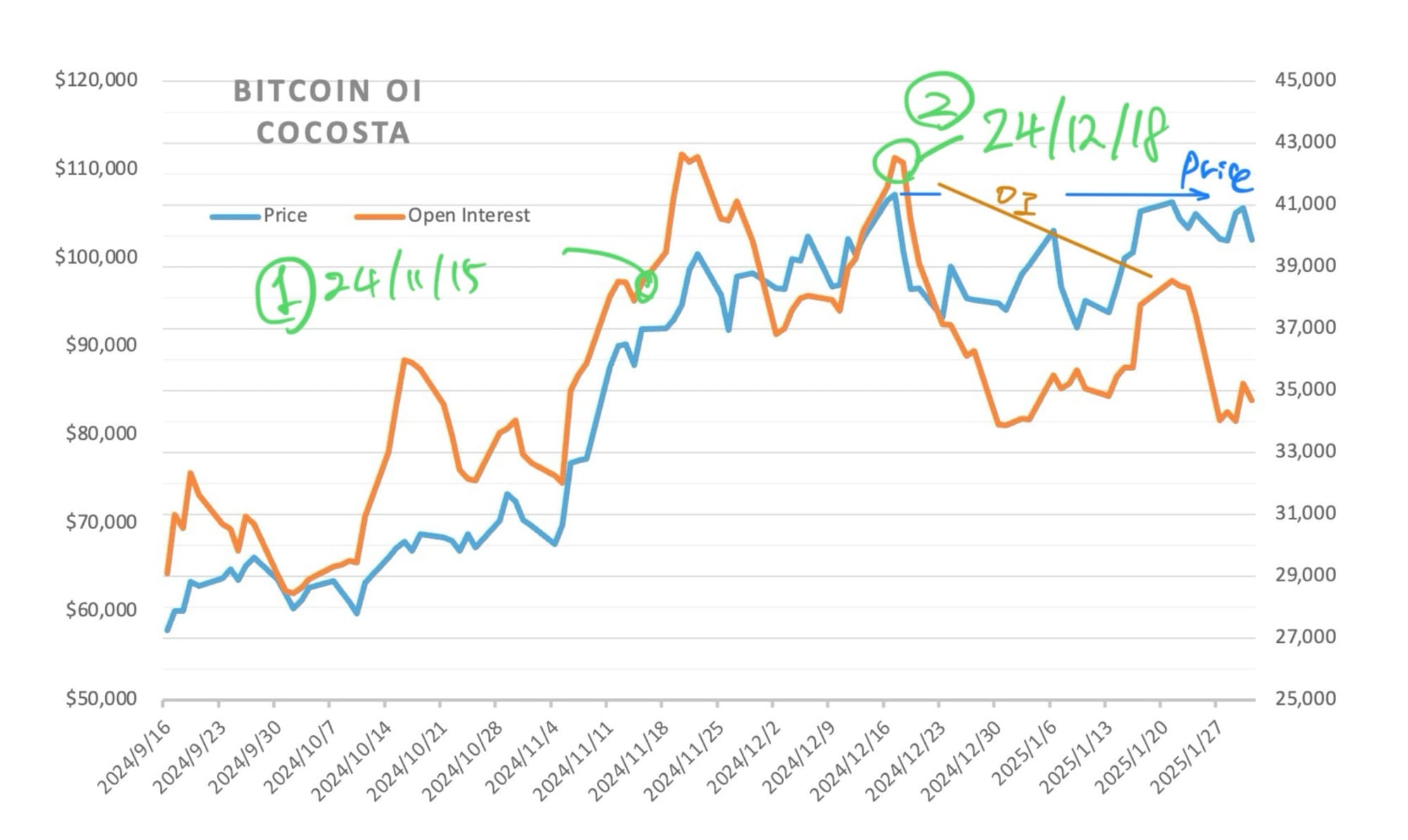 一見すると堅調に見えるビットコイン市場ですが、内部データを見ると異なる側面もあります。特に注目すべきは先物市場の取組高(OI)の推移です。