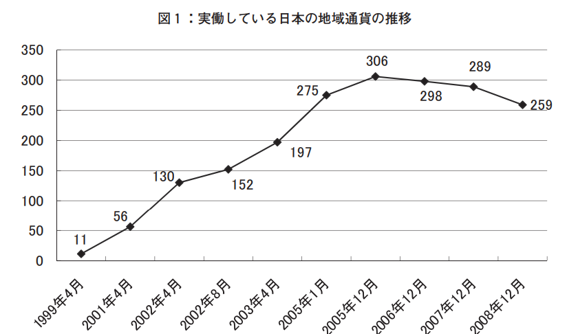 地域通貨というのは、文字通り、ある地域のみで通用する貨幣です。法定通貨との違い、発行主体は中央銀行や中央政府ではありません。たとえば、NPOや、商店街の有志ボランティアや、まれに地方自治体もあるようです。もちろん、現在ではもう少し違う状況でして、デジタル通貨の流通や地域トークンを発行するということになるのでしょう。文献によると、実働している地域通貨は2005年頃にビークをつけていました。300程度の通貨あったようです。