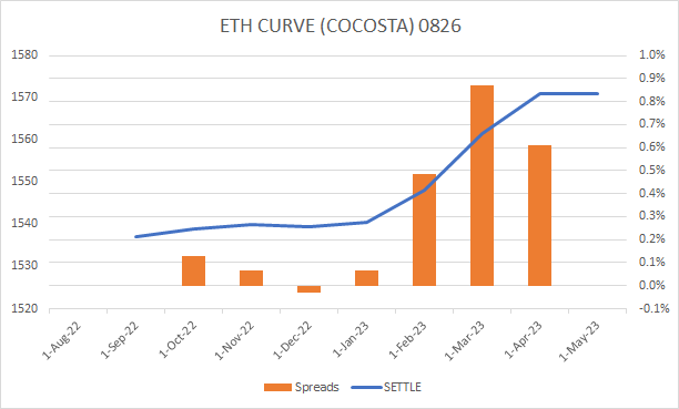 下のグラフはイーサの将来価格を折れ線に、各限月の値段差を棒グラフにしたものです。