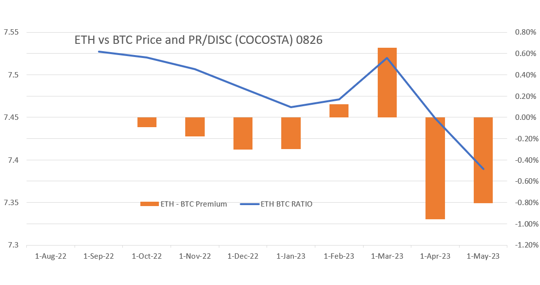 なお、ETHとBTCの先物曲線を比較してみると、もう少し鮮明な市場の意図を見ることができます。