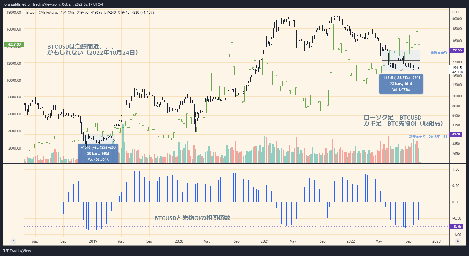 チャート上側のローソク足は、ドル建てビットコインの週足。カギ足は、CME先物のOI(取組高)です。