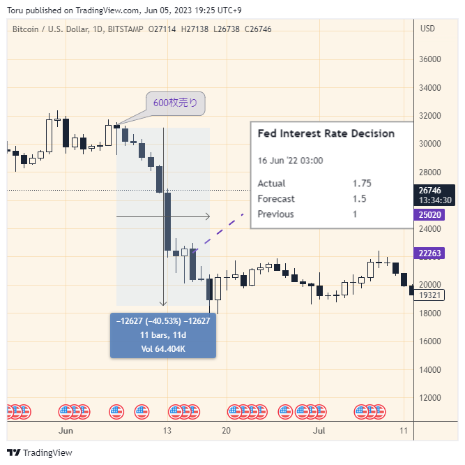 米国中央銀行のFEDが金利を0.75%引き上げたのは2022年6月16日でした。市場予測は0.5%の上昇だったので、このショックでビットコインは、11日間で40%の価格下落となりました(下図)。