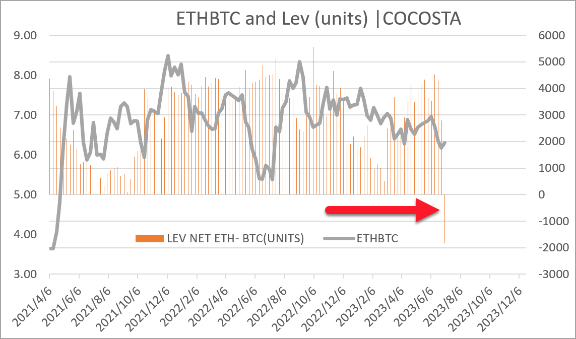 ETHのネット残高(買い持ちー売り持ち)とBTCのそれを比較すると、2021年以降で初めてマイナスに転落しています。