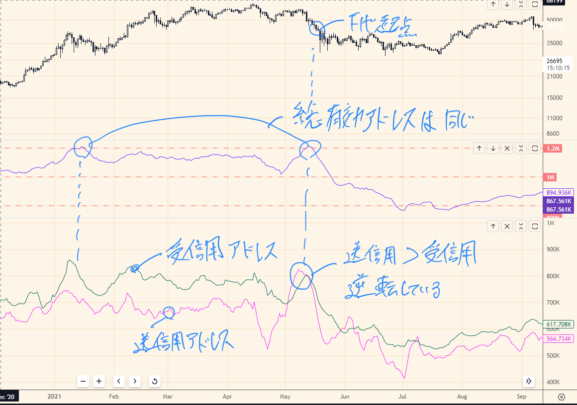 以下はTradingViewのチャートで、ビットコイン価格(BTCUSD)と有効アドレス数の推移を並列で表示したものです。