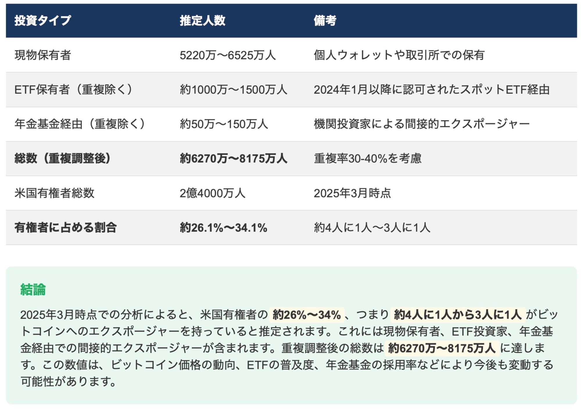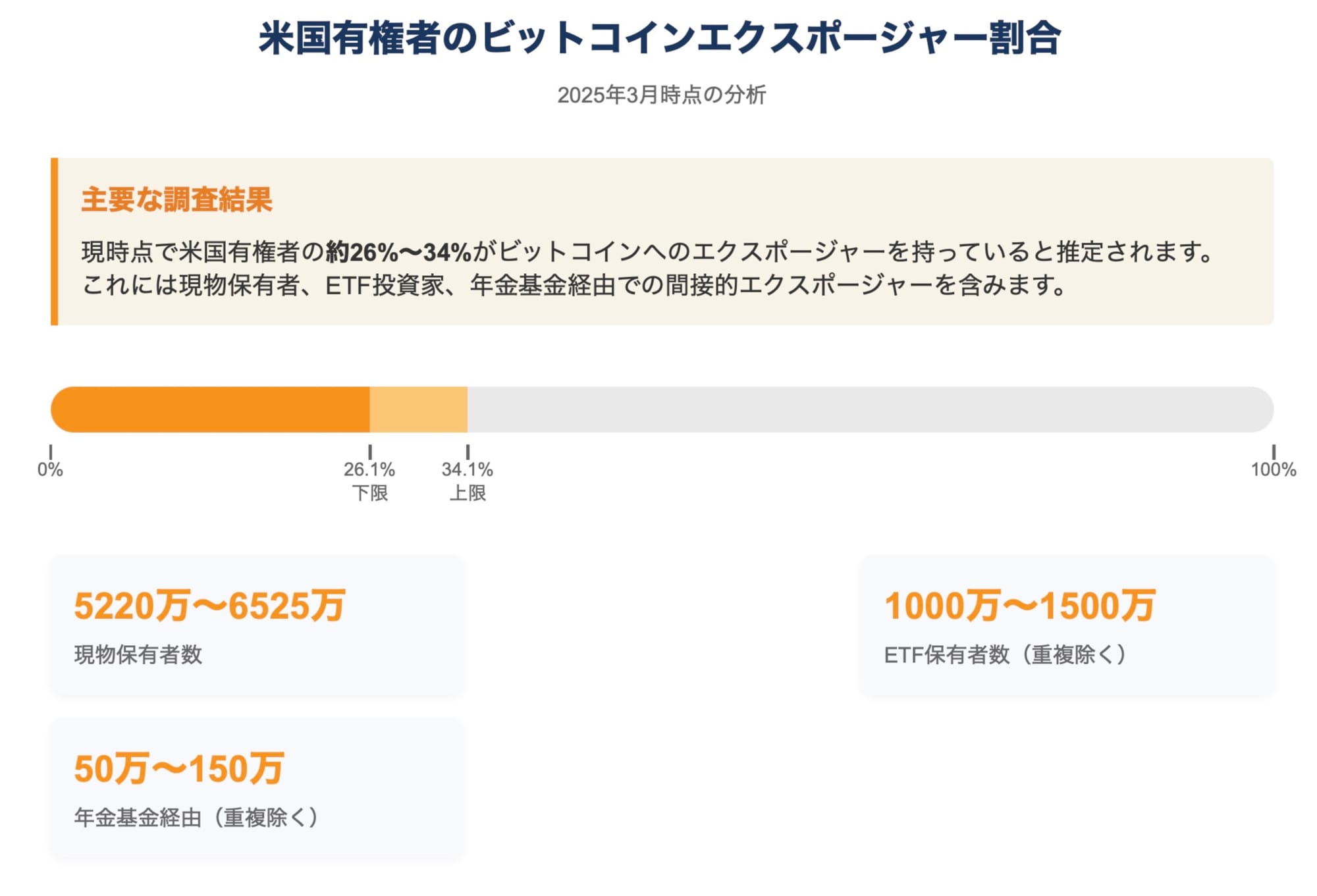 - 米国有権者の約26%~34%(最大で3人に1人)がビットコインに何らかの形でエクスポージャーを持っており、これは潜在的な支持基盤となります。