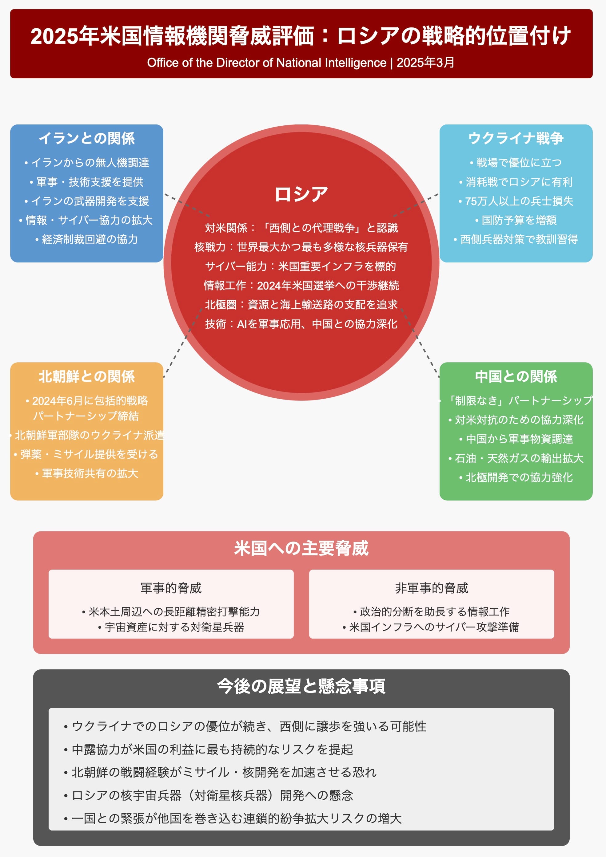 ↑ 図1、ロシアを中心とした2025年米国情報機関脅威評価のインフォグラフィック(Claude作成)