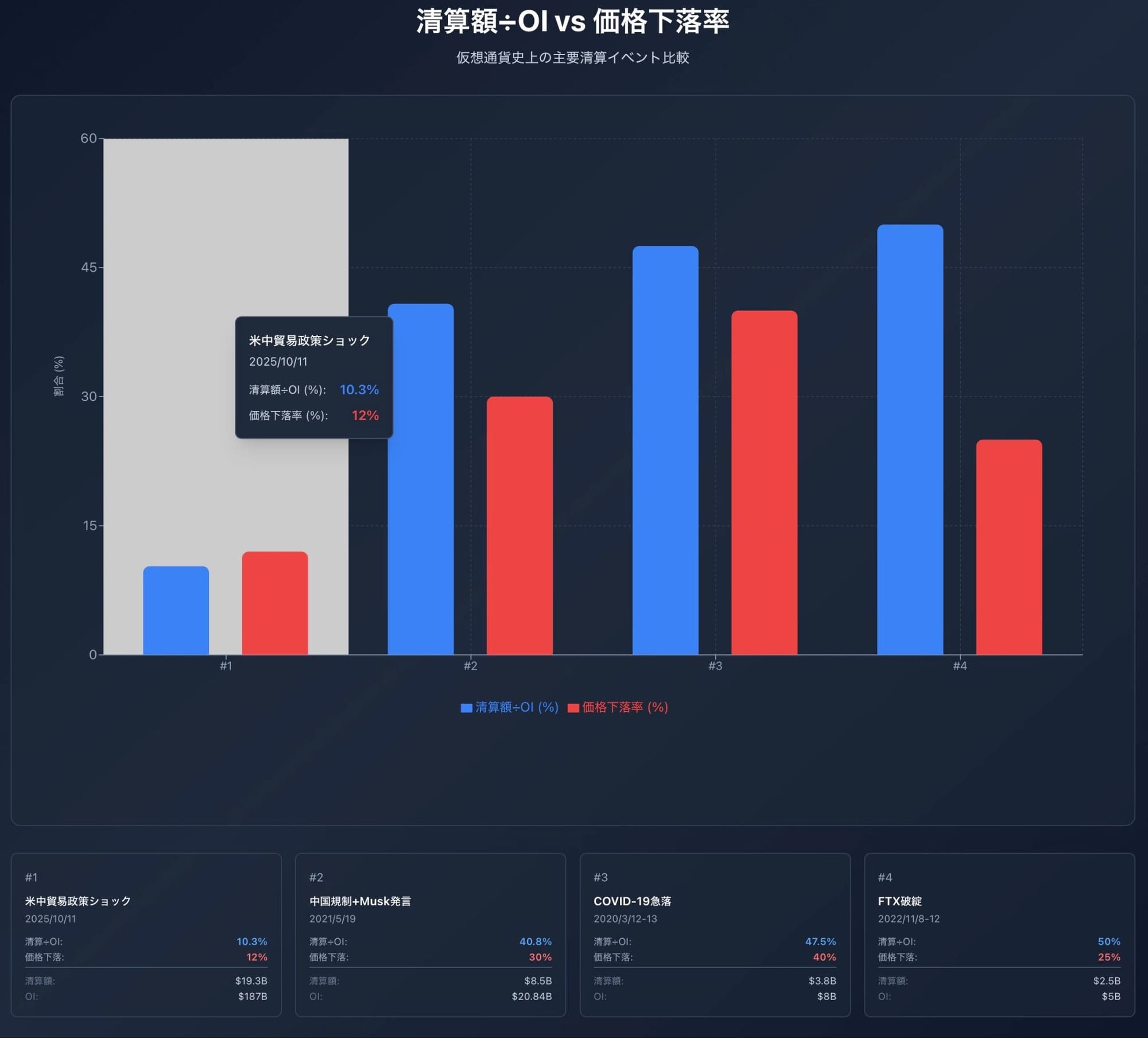 この表は各クラッシュイベントにおける清算額、OI、そしてその比率を示しています。清算額÷OI(%)の数値が小さいほど、市場全体に対するショックが小さかったことを意味します。