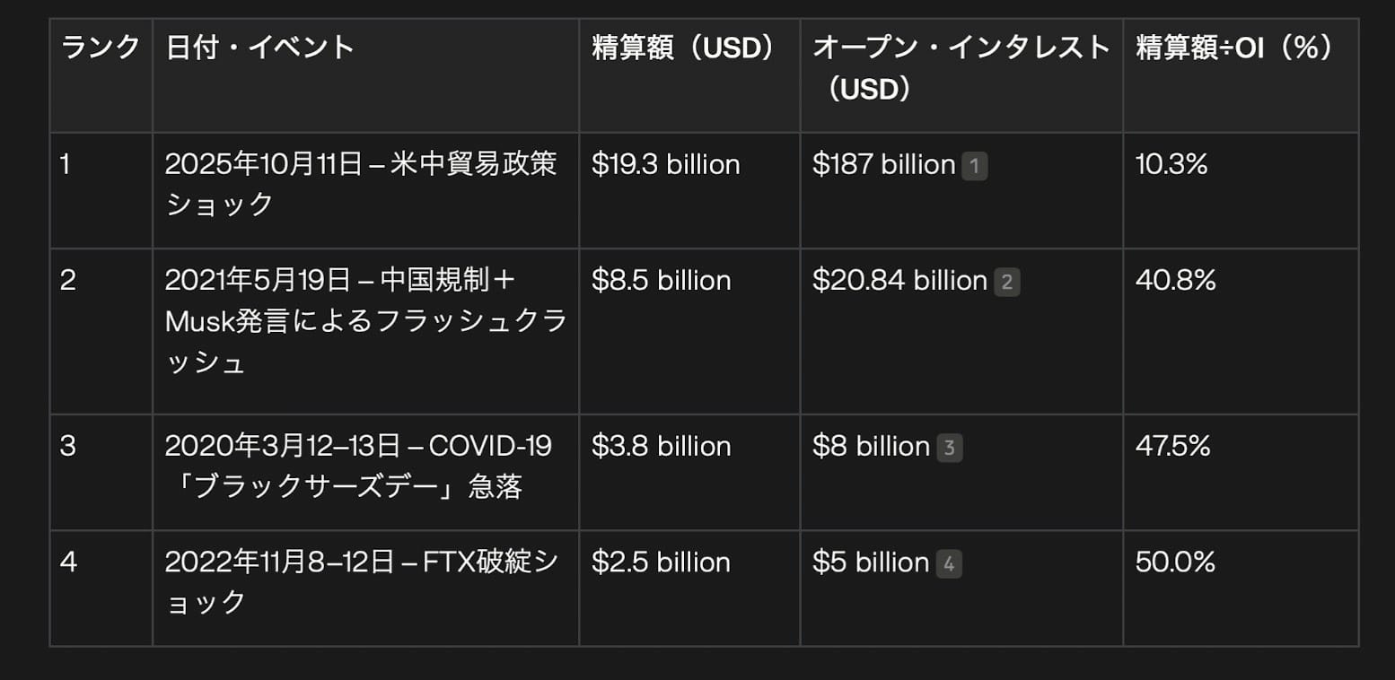 今回の2025年10月の清算額(19.3億ドル)が、2位の2021年China FUD(8.5億ドル)の2倍以上であることがわかります。