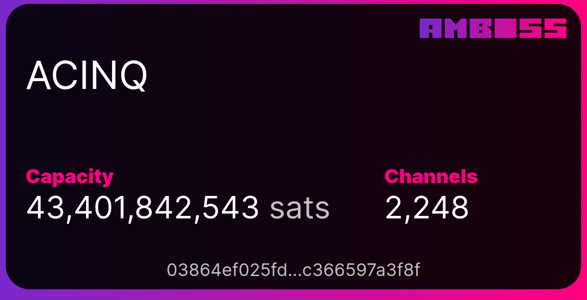 まず、AmbossでACINQのノードを見てみると、なんとパブリックキャパシティが434 BTC、公開チャネル数が2248本もあります。これに加え、Phoenix Walletの各ユーザーと非公開チャネルを1本ずつ持っているので、そこにも少なく見積もって数千本はチャネルが存在します。