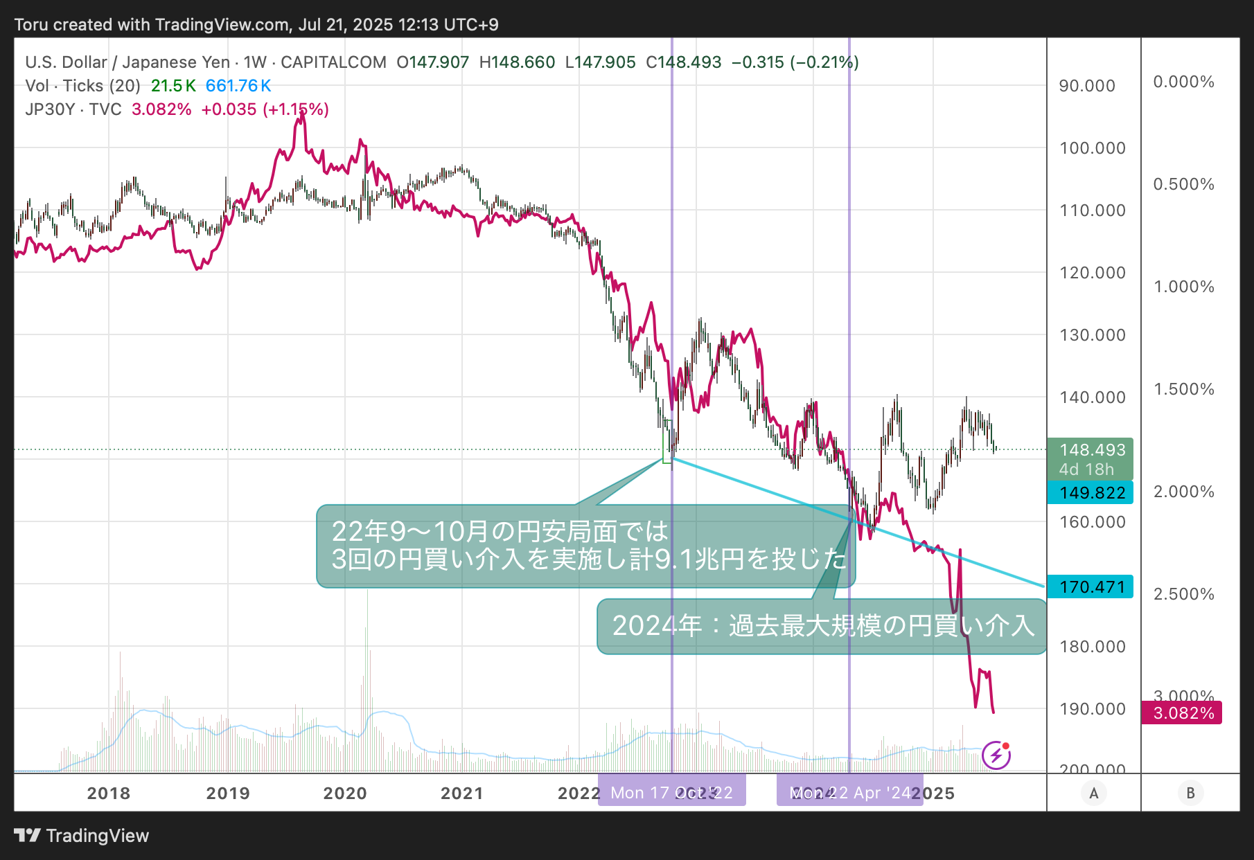 上のチャートを見る限り、日本の30年金利の上昇と円売りの状況とは明らかにリンクしていることがわかります。