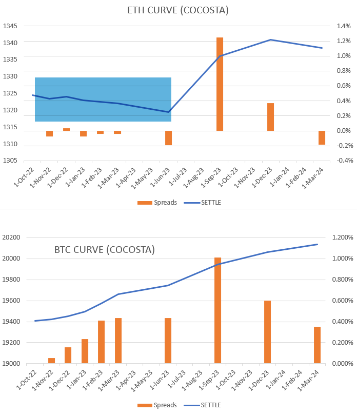 ビットコインは、見慣れた(将来の方が高い)コンタンゴ。一方でイーサリアムの方は、将来の方が安いバックワーデーション。少し異なる気配を醸し出しています。