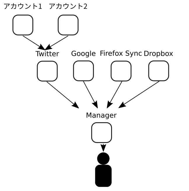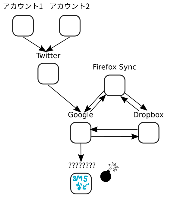 読者の皆様も様々なアカウントを所有していると思いますが、それぞれが「何によってユーザーを認証している(どの経路でパスワードリセットやパスワードの覗き見などを通して乗っ取れる)」か把握されていますか?例えば、多くの人が下のような構造になっていると思います(出典):