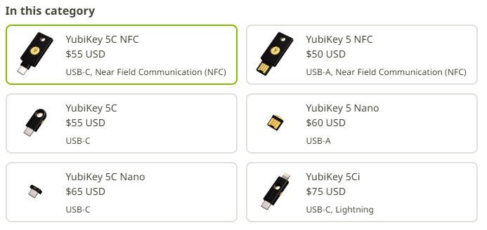Yubikey Bioシリーズは指紋認証がついていますが、$90~$95ほどします。また、FIDO2・U2Fにしか対応していません。同じ対応範囲で廉価版にYubikey Security Key NFCシリーズもありますが、パスワードレスログインのFIDO2・U2Fにしか対応していません。その代わり$25~$29で買えます